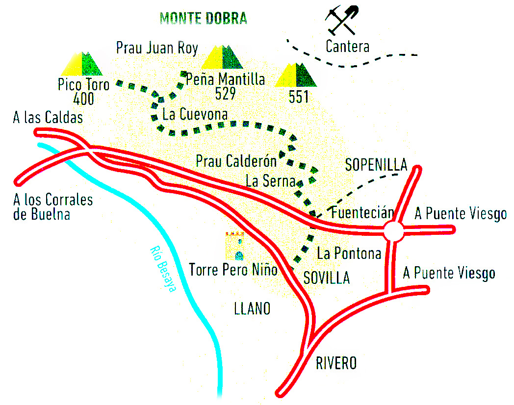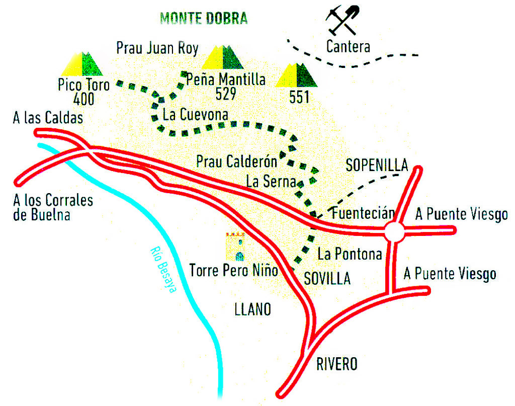 El monte Dobra es muy diferente al monte Tejas, siendo un imponente macizo calizo que culmina en el Pico la capía (606m) y que forma un espectacular escarpe sobre el Valle de Buelna. En su zona superior se han localizado tres castros cántabros de la Edad del Hierro, los de Pico del Oro o Toro, peña mantilla y las Lleras. Para conocer los dos primeros y otros lugares, así como disfrutar de una magnífica panorámica sobre el Valle de Buelna y buena parte de Cantabria, se ha diseñado esta ruta que parte del Barrio de Sovilla.